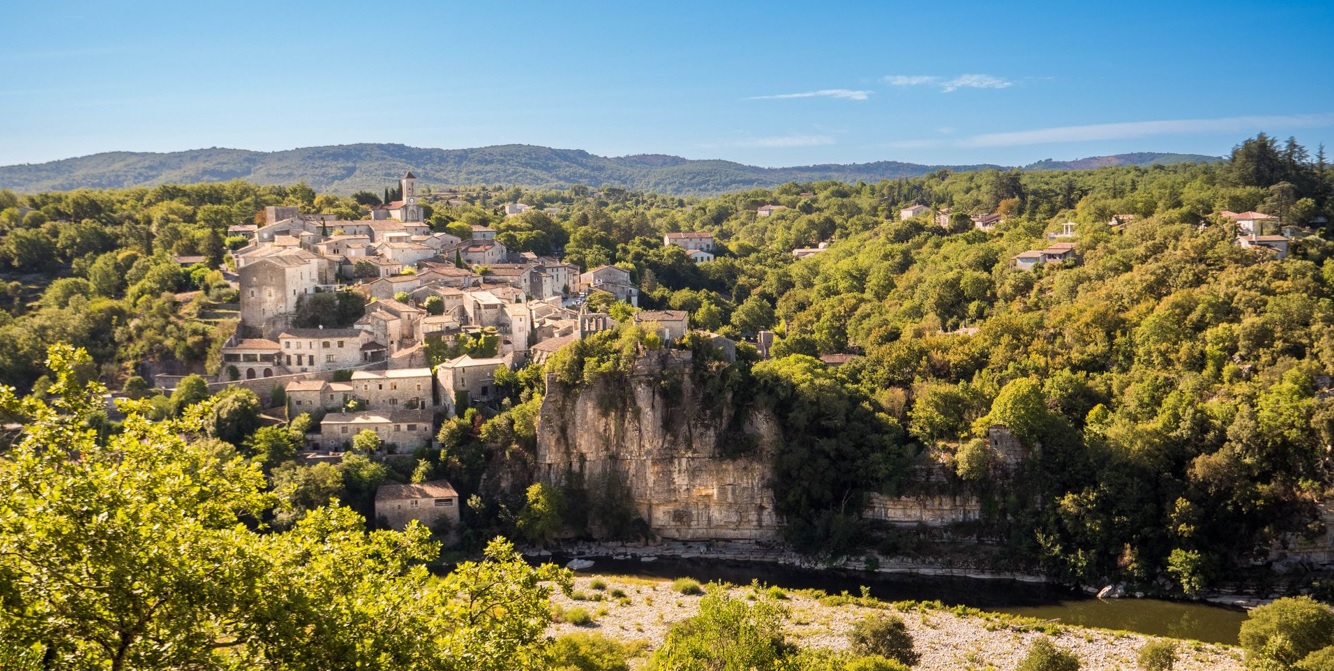 Entreposé sur un rocher escarpé et entouré de remparts et de falaises, le joli village surplombe le cours irrégulier de l'Ardèche. |
