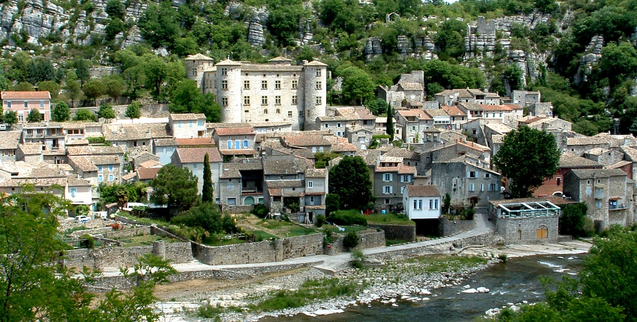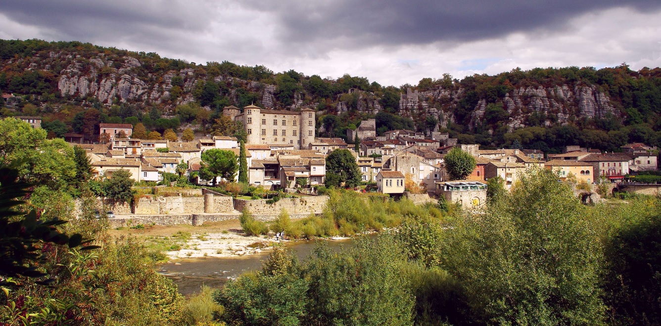 Niché au pied d'une falaise qui surplombe un méandre de l'Ardèche, le village médiéval est encore dominé par son château ancestral. |