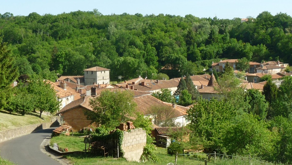 Ce petit village de Charente Limousine, blotti au milieu de la verdure, laisse apercevoir ses toits rouges dominés par celui de sa belle église romane. |