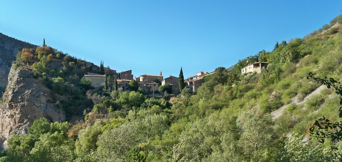 Le village se blotti contre une paroi rocheuse, comme un berceau adossé au donjon de l'ancien chateau qui fait office de cimetière auquel on accède par des ruelles étroites et des escaliers. |