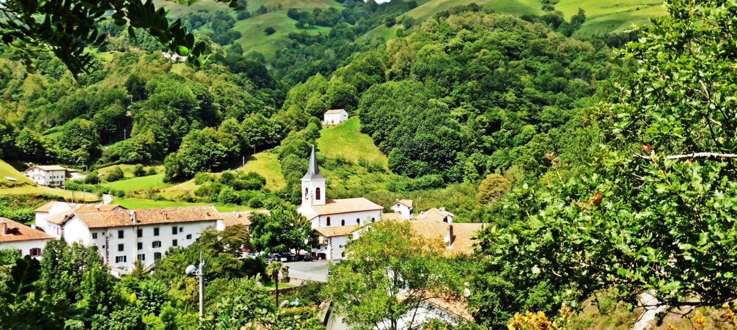 Au bord d'un bras de la Nive, le joli petit village s'étale au coeur d'une vallée magnifique du même nom qui signifie "Chemin des hauteurs". |