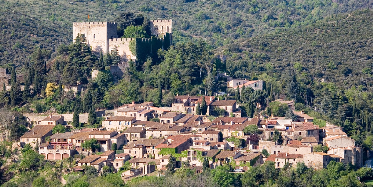 Au centre d'un magnifique cirque de collines sur les derniers contreforts du Canigou, le château de Castelnou prend appui sur une arête schisteuse et coiffe de ses murs crénelés le village fortifié à l'architecture catalane. |