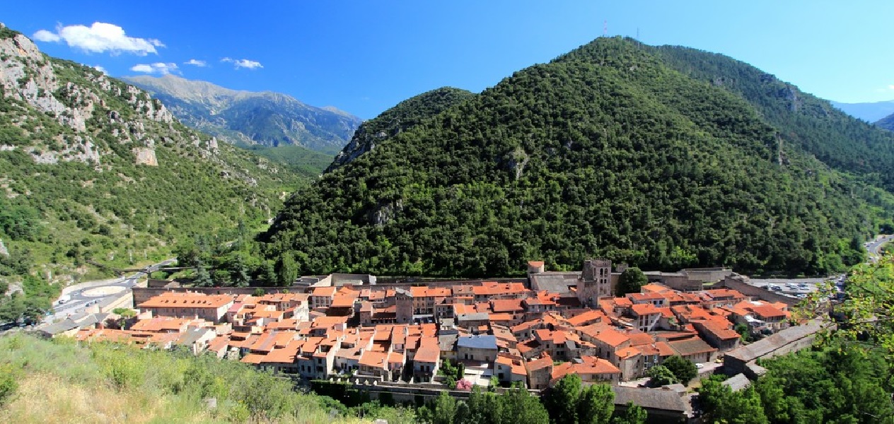 Entourée d'une puissante enceinte fortifiée, cette petite cité commande une vallée encaissée que le Massif du Canigou sépare de l'Espagne. |