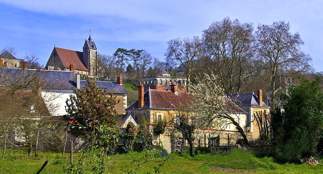 Au coeur de la vallée du Loir, les maisons en pierre de tuffeau s'alignent le long d'un coteau dominé par l'église aux remarquables fresques romanes. |