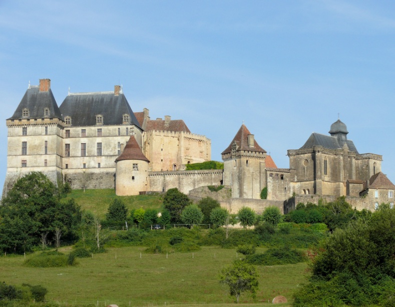 Biron : classé monument historique juché sur un éperon rocheux, le gigantesque château domine le village restauré de Biron aux pierres ocres et qui s'étale jusqu'en bas. Le château possède un donjon du XIIe siècle, une chapelle à double étage dans laquelle se trouvent deux tombeaux. Le site du village appartenant aux villages de caractère du Périgord, est agréable car il domine un paysage de verdure planté de chênes et de châtaigniers. |