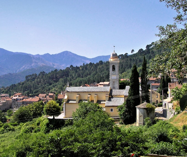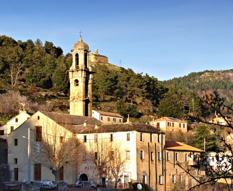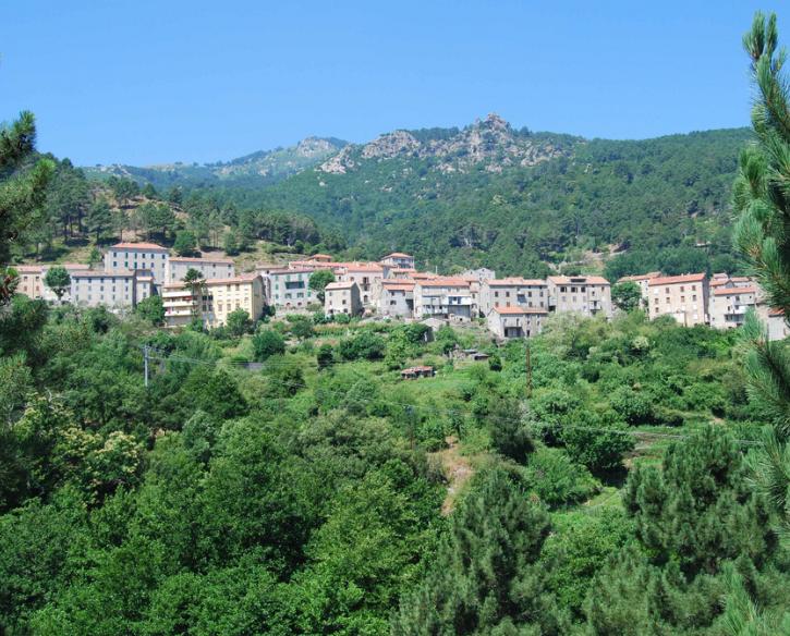 clôturent la cuvette où se niche le village à 660 mètres d'altitude. On voit d'abord ses toits de tuiles rouges puis les hauts murs sévères de ses maisons partiellement recouverts par les lichens. La cité est dominée par de belles forêts de hêtres bruissants, de pins laricios, de sapins pectinés et de bouleaux. Les eaux du Fiumorbo tout proche, sont réputés auprès des pêcheurs de