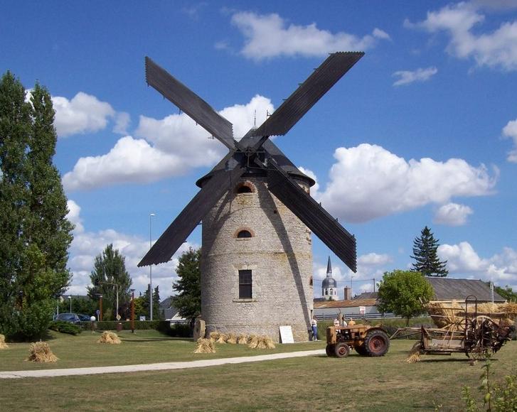 | Artenay : l'entrée du village est signalée par un ancien moulin de pierre construit en 1849. Dans le bourg, l'église édifiée sur une période de cinq siècles, à partir du XIIe siècle, représente le principal monument de la commune. Son superbe clocher du XVIIe siècle, coiffé d'un dôme surmonté d'une flèche, signale sa présence à plusieurs kilomètres. L'ensemble des 19 vitraux datant du XIXe siècle est composé de motifs géométriques et floraux et de scènes figuratives avec des personnages. |