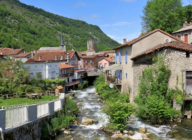 Mauléon Barousse (Photo Michel Vincendeau sur http://www.mesvoyagesenfrance.com) : le village semble effectivement perdu à l'écart des axes touristiques de la région, d'autant que la vallée de l'Ourse se resserre en défilé à l'approche de cette ancienne capitale féodale. Ce sont d'ailleurs les vieilles pierres évocatrices de ce passé que l'on remarque dès l'abord du village. Le château du XVe siècle occupe le devant de la cité, à cheval sur les deux torrents donnant naissance à l'Ourse. Couronnent cette bâtisse un donjon carré, une étonnante tour pentagonale et une grande tête sculptée. |