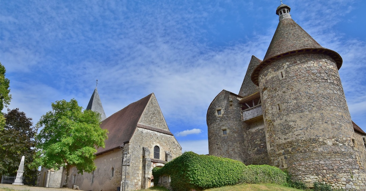 Bâti au sommet d’une éminence naturelle au XIIe siècle, le château presque entièrement refait au XVe siècle, domine avec l'église les quelques maisons du village et un étang fort agréable. |
