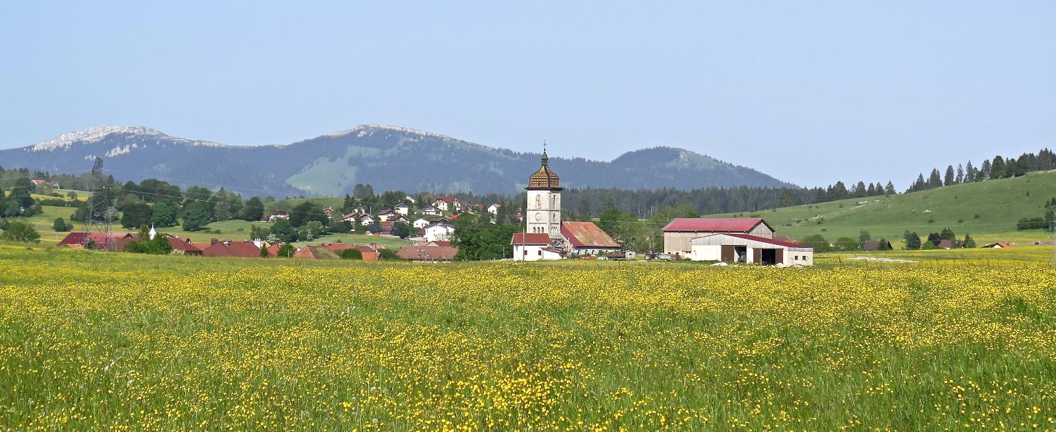 Au pied des derniers sommets du Jura, c'est un village rue bordé de deux rangées de maisons disposant par derrière d'un accès direct aux pâturages. |