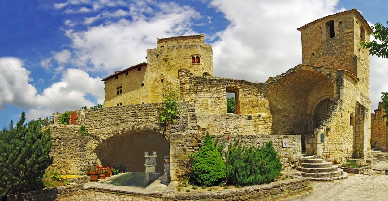 Au milieu des lavandes et des blés, l'ancienne commanderie de l'ordre de Malte est un village en forme de pyramide coiffé d'un château et d'une chapelle romane. |
