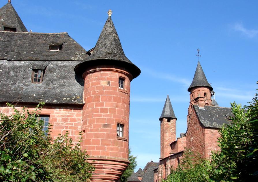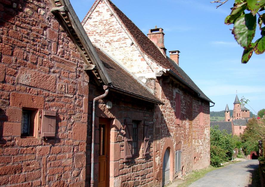 Quelle extraordinaire vision médiévale : toute rouge et rose, Collonges est d'abord un bourg muré. Ses constructeurs ont su exploiter le trésor de grès rouge du massif de l'Habitarelle qui la surplombe. L'enceinte du village conserve deux de ses portes par lesquelles transitait le commerce d'huile de noix et de vin du XVIe au XVIIIe siècle. La cité a été essentiellement aristocratique, les blasons en témoignent, castels, tours, échauguettes foisonnent. La construction de l'église et du prieuré fondés par les moines de Charroux remonte à un passé lointain, au VIIIe siècle exactement. Cette cité dont il semble que le sang bat "à fleur de pierre" est à visiter absolument. Centres