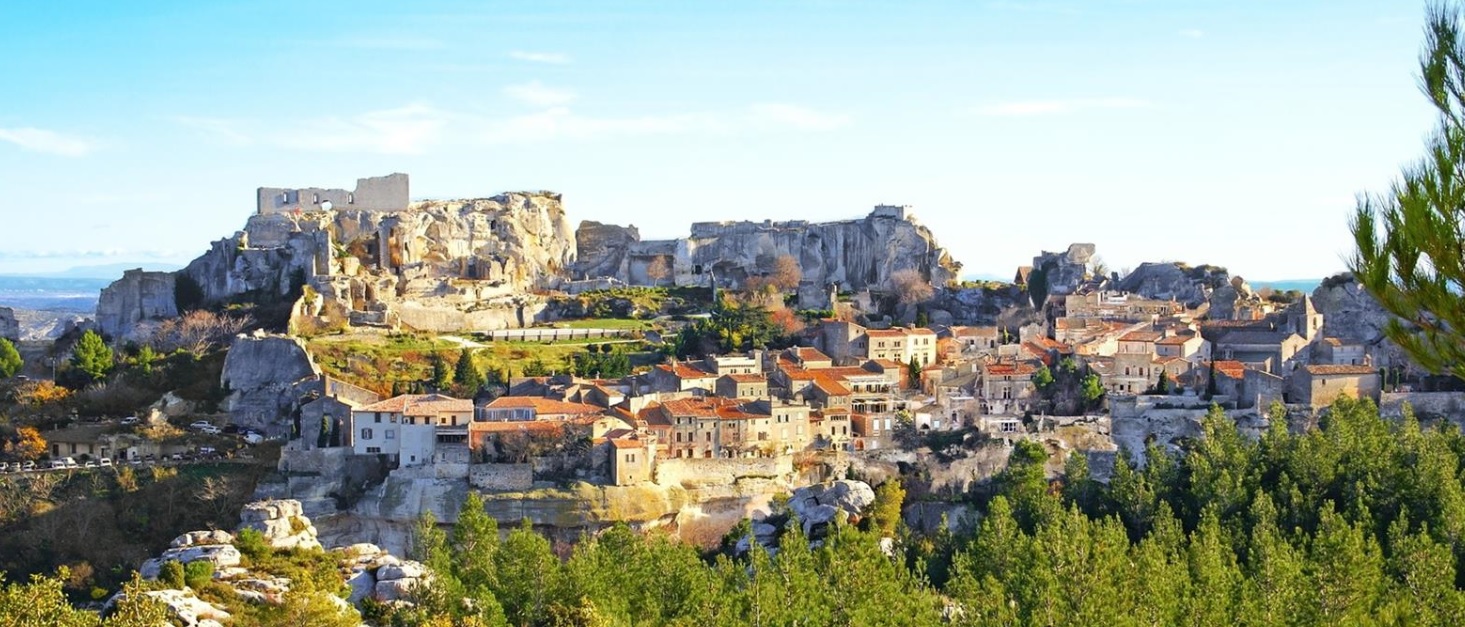 Entre un précipice vertigineux et les impressionnantes ruines de sa forteresse très longtemps inexpugnable, le plus visité des villages français se cale sur un éperon rocheux des Alpilles, entre le vallon de la Fontaine et le Val d'Enfer. S'étendant sur la falaise, (les ruines se confondent presque avec la paroi rocheuse), Les Baux de Provence (du provençal baou "piton") se composent d'une partie basse très animée avec ses rues pavées bordées d'élégantes maisons Renaissance, sa charmante place, et son église St Vincent du XIIe siècle, et puis d'une partie haute désertée, jadis séparée du village par un rempart et un fossé : "la cité morte" qui domine le Val d'Enfer. Centres