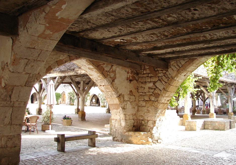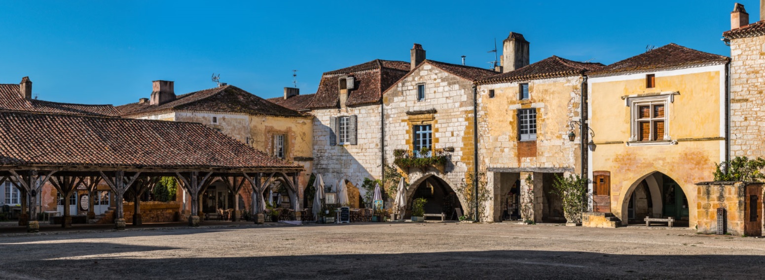 Cette cité fortifiée du XIIIe siècle fondée par Edouard 1er d'Angleterre a vu une trentaine de ses constructions classées monuments historiques. Elle apparaît comme la plus pure des bastides. Ses trois portes s'ouvrent sur des rues bordées de maisons ocres et blanches où tout est harmonie, jusqu'aux dimensions des façades, les mêmes pour ces ravissantes habitations. Sous la halle, on voit encore les mesures à grain du XVe siècle. Avec ses galeries à arcades gothiques, ses cafés et ses avenantes boutiques, la place des Cornières - coeur et chef d'oeuvre de Monpazier - est l'endroit idéal pour goûter un après midi ensoleillé... ainsi que les spécialités locales : fraises, châtaignes ou champignons. Centres