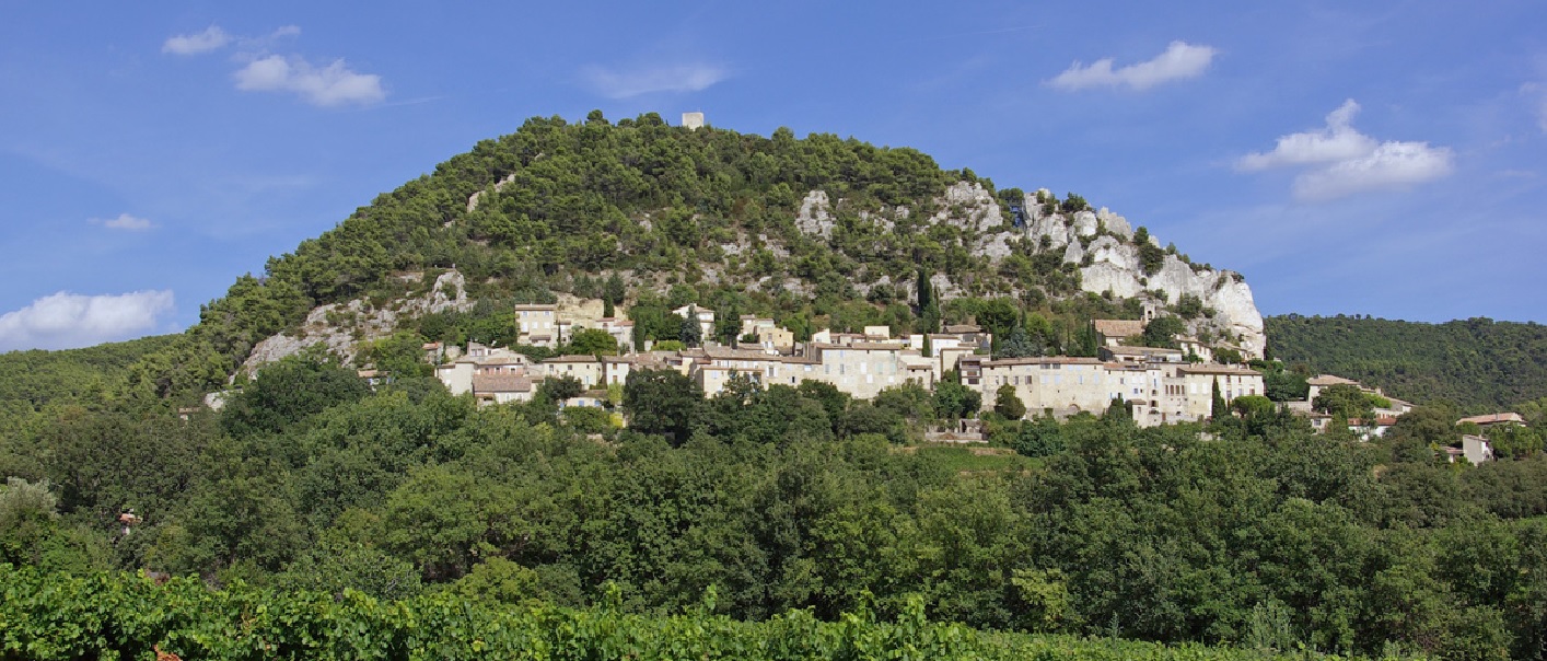 A flanc de colline avec pour horizon les pics déchiquetés des Dentelles de Montmirail, se dresse dans un paysage de vignes le village dominé par la tour de l'ancien château médiéval. |