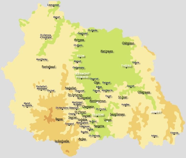 Aux alentours, découvrez le château de Parentignat et les vestiges du prieuré de Sauxillanges. Emerveillez vous devant Issoire et les villages perchés de Nonette, Auzon, Montpeyroux, St Floret, Montaigut le Blanc. Faites une sortie enfin dans le massif du Livradois vers Ambert et le village de Blesle en Haute Loire. |