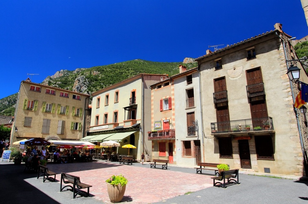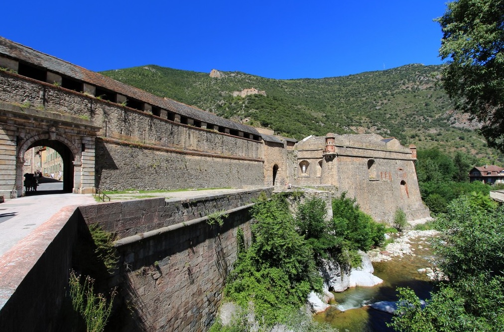 Entourée d'une puissante enceinte fortifiée, cette petite cité commande une vallée encaissée que le Massif du Canigou sépare de l'Espagne. |
